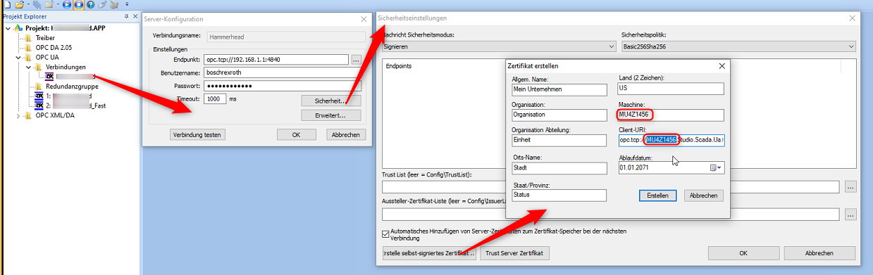 In addition the communication of the WinStudio located OPC UA client and (ctrlX CORE placed )OPC UA server is not fullfilling the security standards regarding the security-politics. the client does not talk the "security-languages" the server offers.