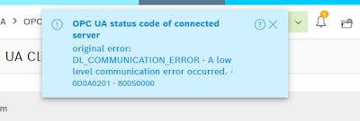 ctrlX OPC UA client to a Rexroth IoT Gateway OPC UA server error DL_COMMUNICATION_ERROR