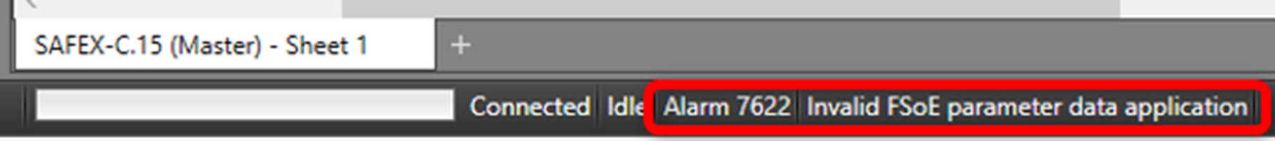 In this example after activating FSoE Device Diagnostics, "Alarm A7622 Invalid FSoE parameter data application" can be seen in the status line of ctrlX SAFETY Engineering: