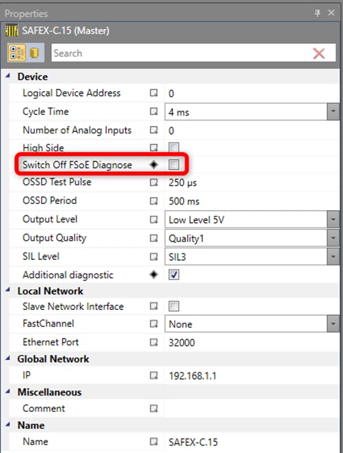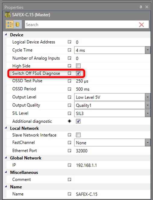 The default setting for “Switch Off FSoE Diagnose” is checked in the properties of the SAFEX-C.1x: