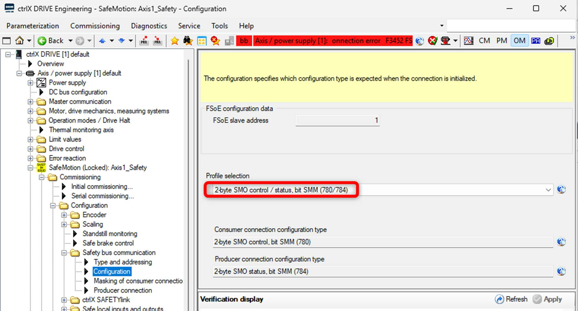 The cause was the profile in ctrlX DRIVEplus was set to 2Byte SMO control/status bit SMM (780/784) and in ctrlX SAFETY Engineering was set to 2Byte Binary-Coded SMM (781-785):