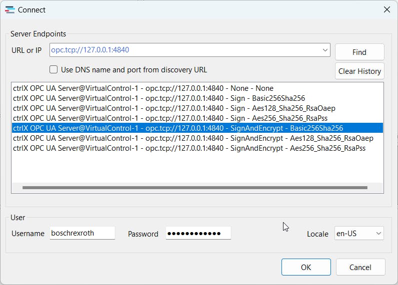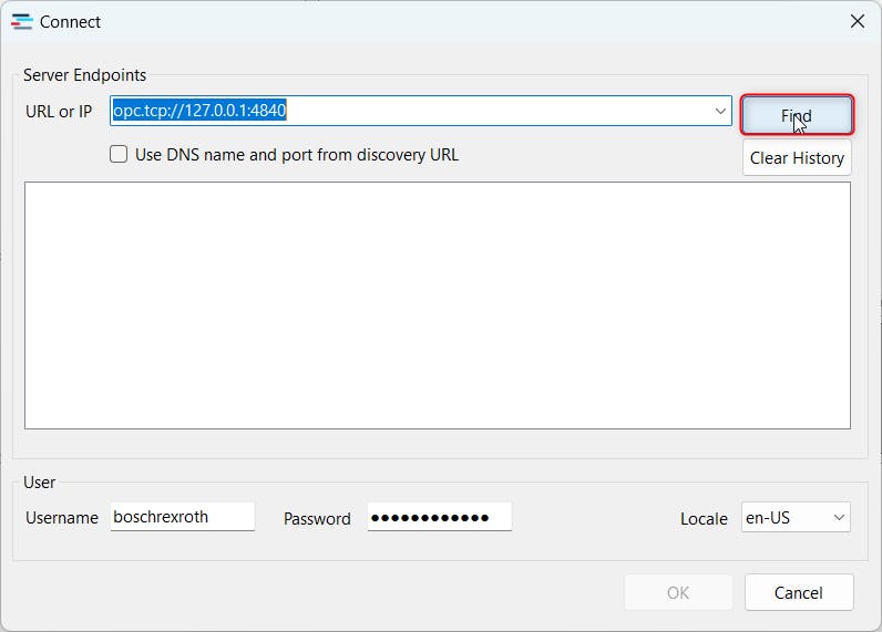 Insert the URL of your ctrlX Core in the format opc.tcp://<HostAddress>:4840 and provide the corresponding User credentials . Then press "Find" to display all available connections.