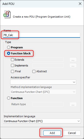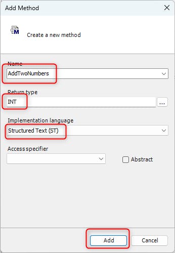 Inside the Function Block create a new method. To do this select the Function Block right click and navigate to "Add Object" and select "Method...". In the Method properties, set the Name to "AddTwoNumbers", the "Return Type" to "INT" and the "Implementation Language" to "ST".