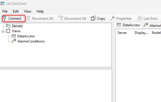 Open the UA.TestClient tool. Then select "Connect" to establish a connection to the local OPC UA server.
