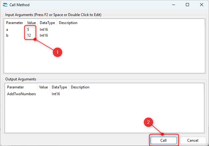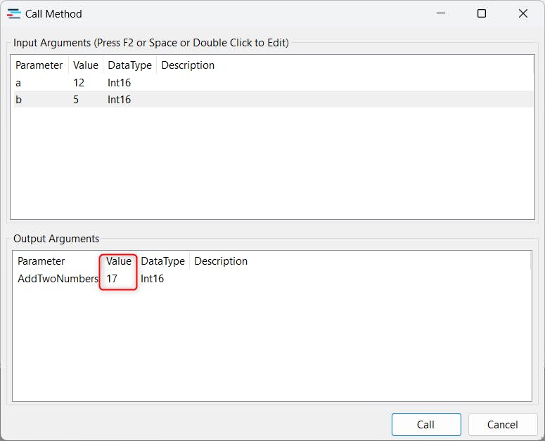 Enter input arguments in the Value column, then select "Call" to execute the method.
