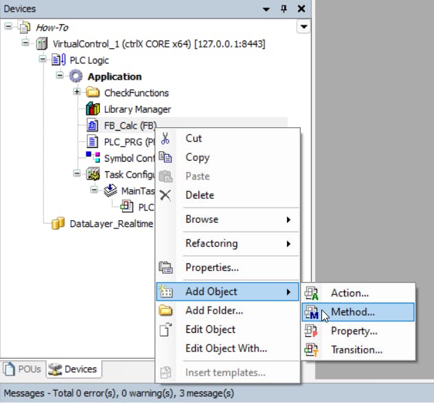 Open ctrlX PLC Engineering. To add a Function Block select the Application and there navigate to "Add object" and select "POU...". In the properties of the Function Block set the Name to "FB_Calc" and select the Type "Function Block".