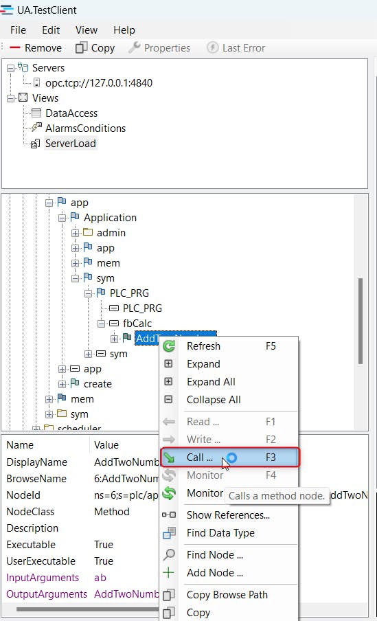 Once the connection is established, navigate through the path /Objects/Datalayer/plc/app/Application/sym/PLC_PRG/fbCalc/ and locate the method "AddTwoNumbers". Select "AddTwoNumbers" and then choose "Call" to execute the method.