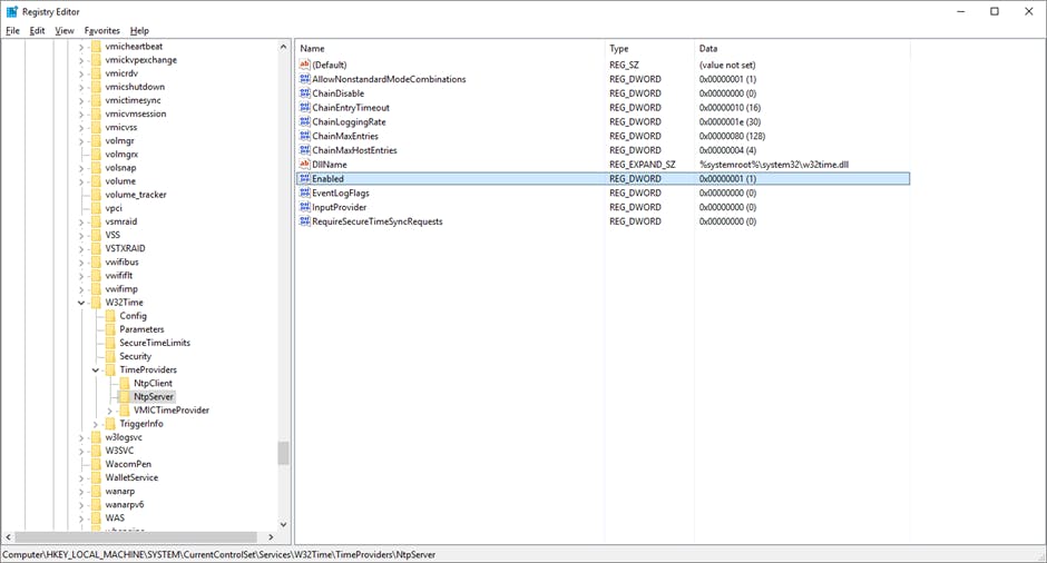 Search for the key “HKEY_LOCAL_MACHINE\SYSTEM\CurrentControlSet\Services\W32Time\Timeproviders\NtpServer”