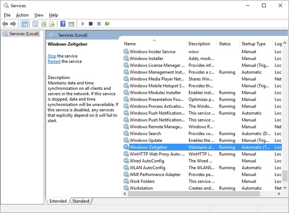 Start the service “Windows Zeitgeber” again and set the “Startup Type” to “Automatic”.