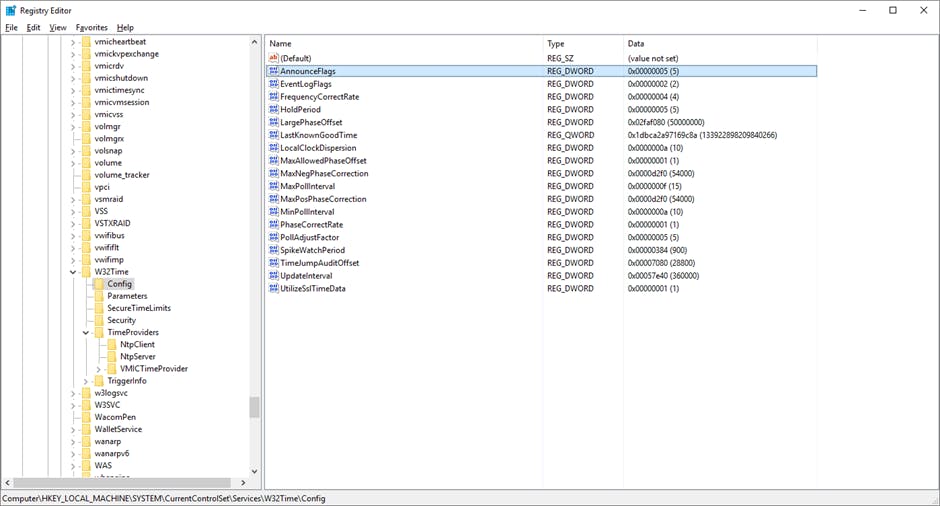 “HKEY_LOCAL_MACHINE\SYSTEM\CurrentControlSet\Services\W32Time\Config”
