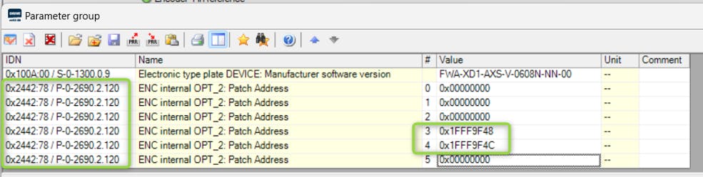 Example for determining source pointer addresses with encoder connected to XG21 for firmware/runtime version AXS-V-0608 (list elements marked):Source pointer addresses with encoder connected