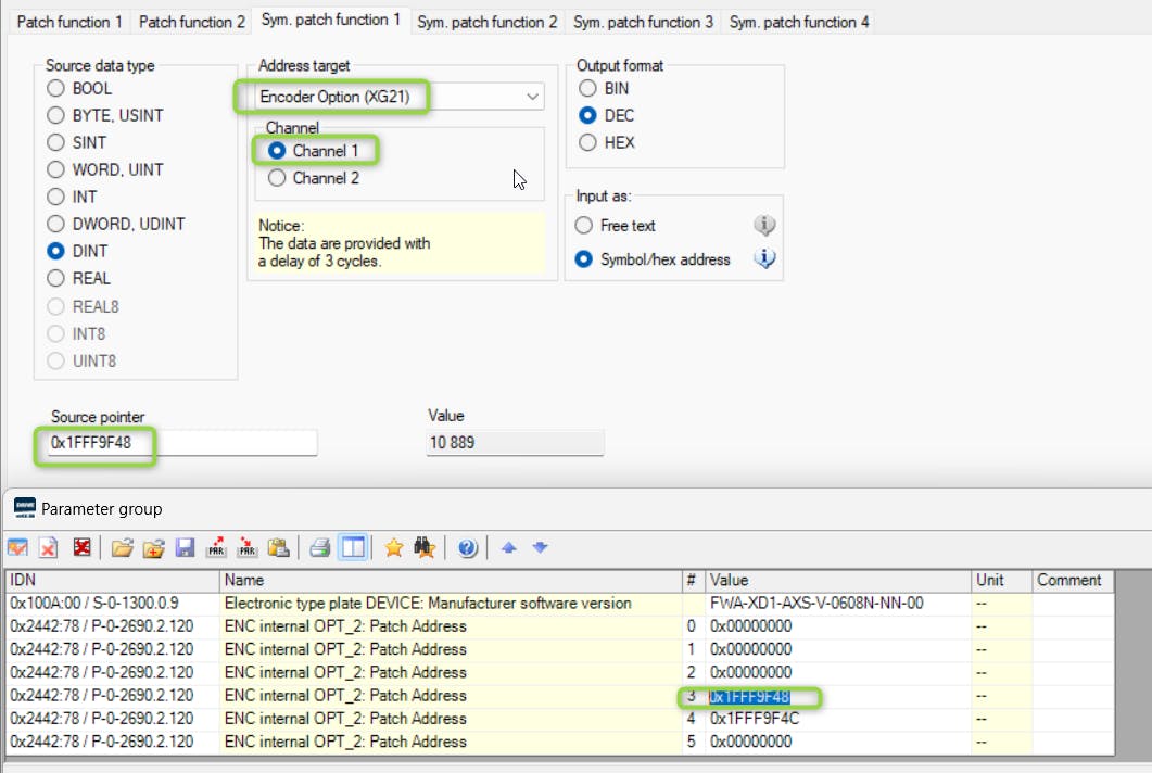 Enter the source pointer addresses for the SinCos track signals in the dialogue for ‘Symbol-based patch function’, configure the input and output data of the patch function!