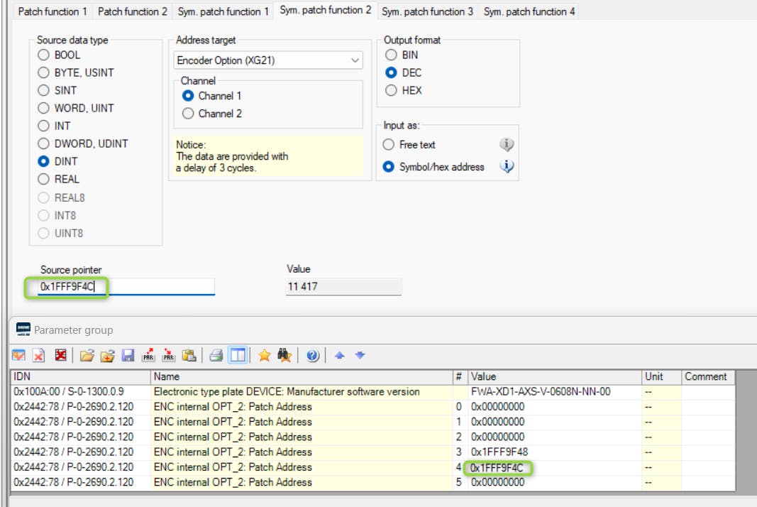 From AXS-V-0404 (...and later) the source pointer addresses for the sine and cosine signal are displayed for use in the symbol based patch function in list elements LE 3 and LE4 of P-0-2690.x.120.