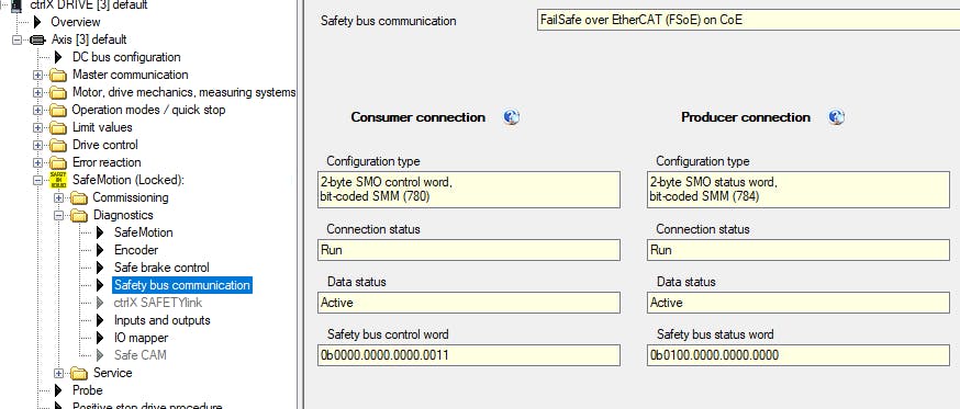 After switching the EtherCAT master to OP you can check safety control and status word and if the communication is running on a safety bus communication diagnostic screen.