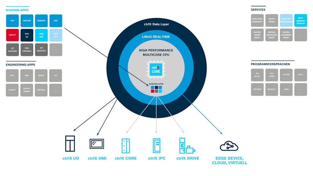 In terms of hardware the ctrlX CORE is a consistent open and totally hardware independent control platform. A powerful 64-bit multicore CPU gets universally implemented in embedded, IPC or drive systems. Since it is one physically identical control platform, there are no software boundaries between topologies and no hurdles for future CPU upgrades.