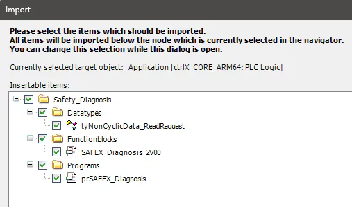 Step 1: Import the attached function block* for either FB-Type1 (SAFEX_Diagnosis_1V04.export) or FB-Type2 (SAFEX_Diagnosis_2V00.export)