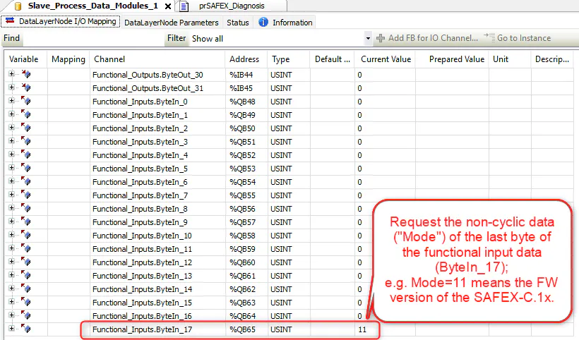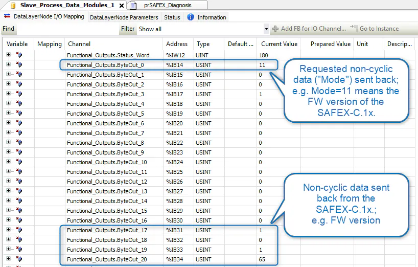 Make sure that the “Additional diagnostic” is activated in the properties of the SAFEX-C.1x for both FB-Types: