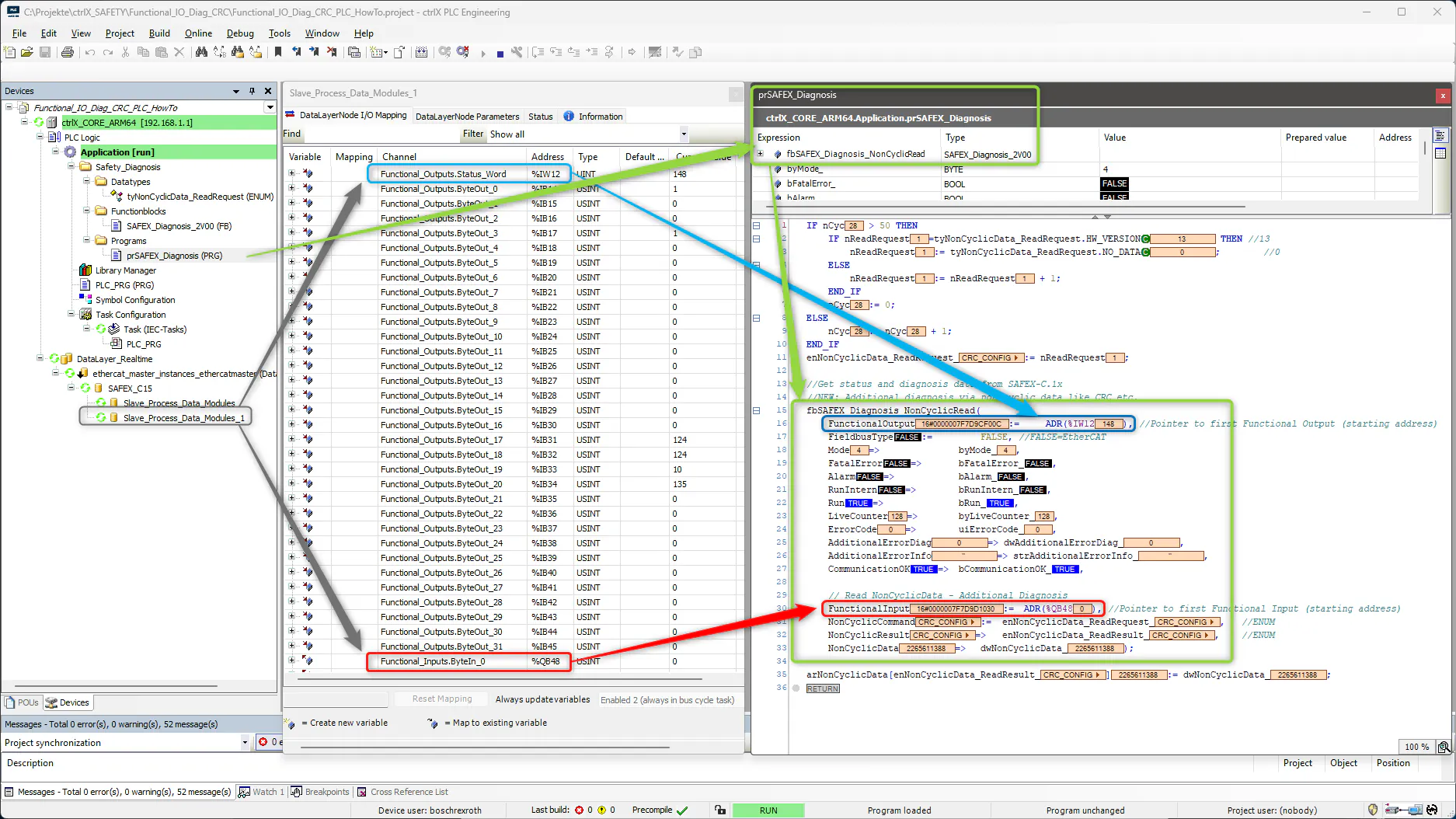 This PLC function block reads the diagnosis information from ctrlX SAFETY controller SAFEX-C.1x and monitors the communication.