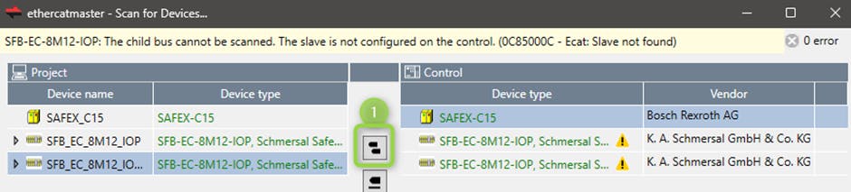 [callout type="info" text="If no or not the correct number and order of devices are displayed, check the EtherCAT connections. If a device is detected but the text "ESI file not installed" is displayed, then please repeat step 6 or check the connected device."]