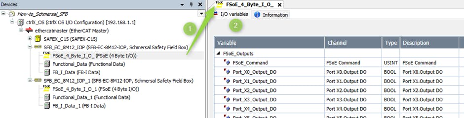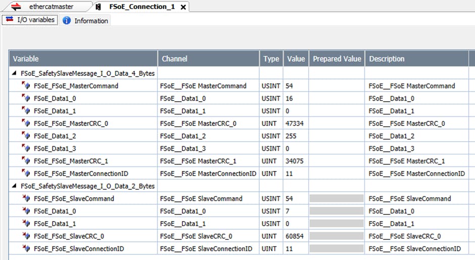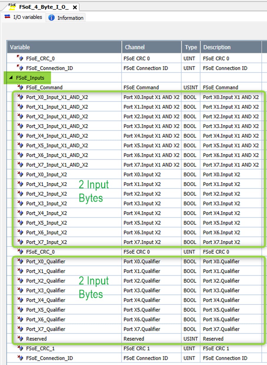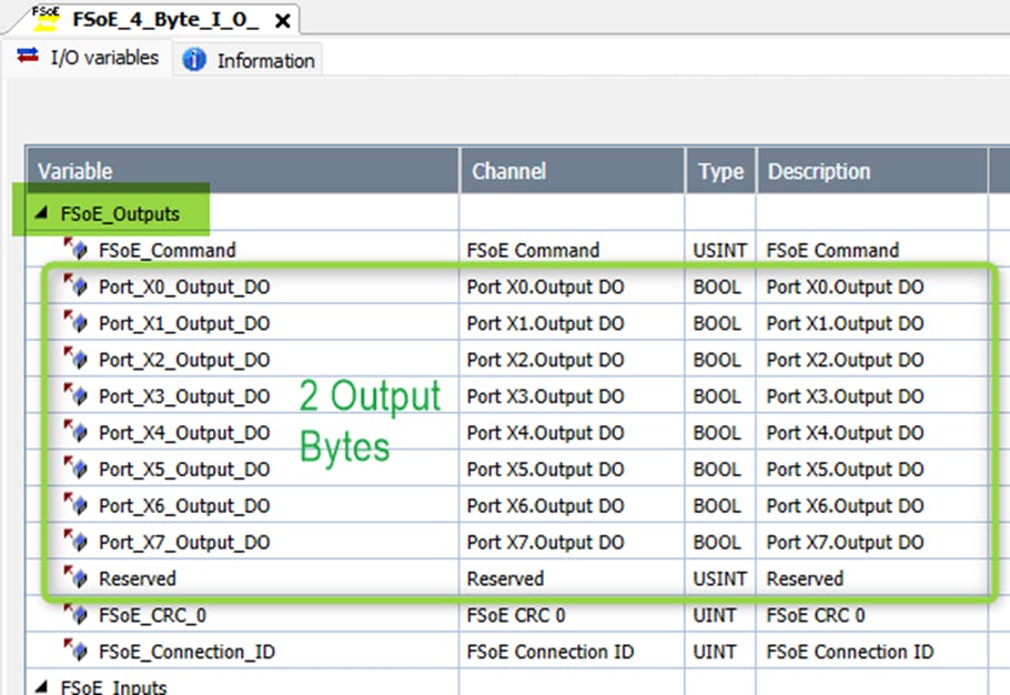 To do this, open the display for the FSoE module (view: I/O variables) and count the number of FSoE outputs and input bytes (do not count FSoE_Command, all FSoE_CRC_x (x=0, 1, 2, ...), FSoE_Connection_ID)!
