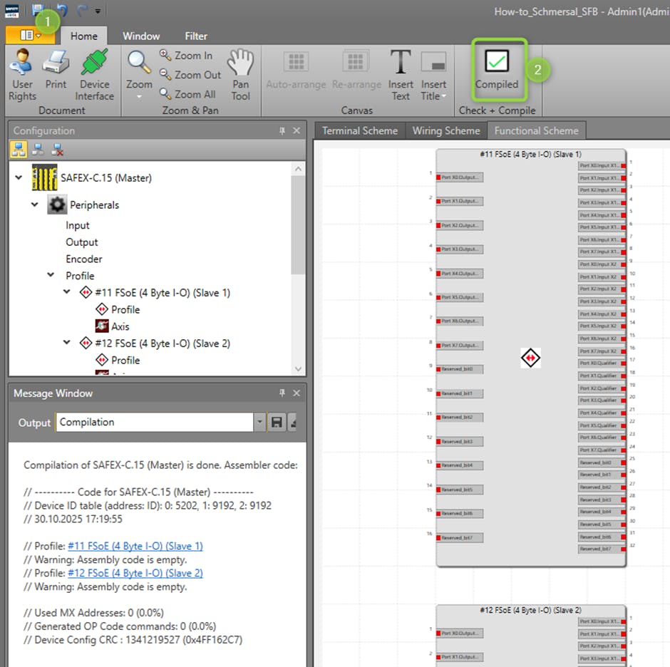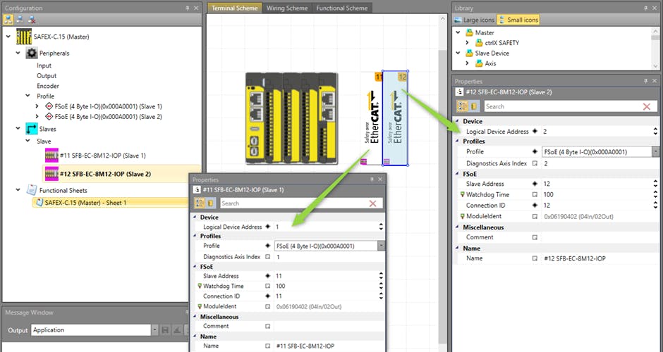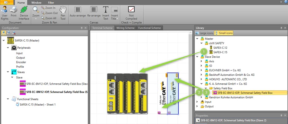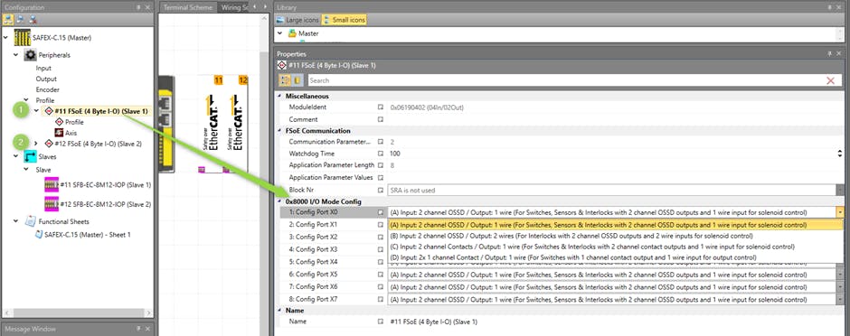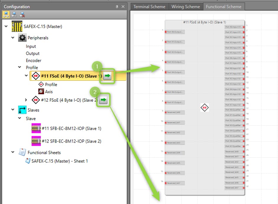 Create a new Safety-project “configuration” and drag and drop a SAFEX-C.15 and both SFBs in the “Terminal Scheme”.