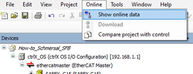 Fig. 17.: Download of the EtherCAT-configuration into ctrlX CORE Optional: Switch to „Show online data” to get the actual data of the configuration.