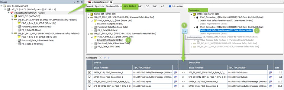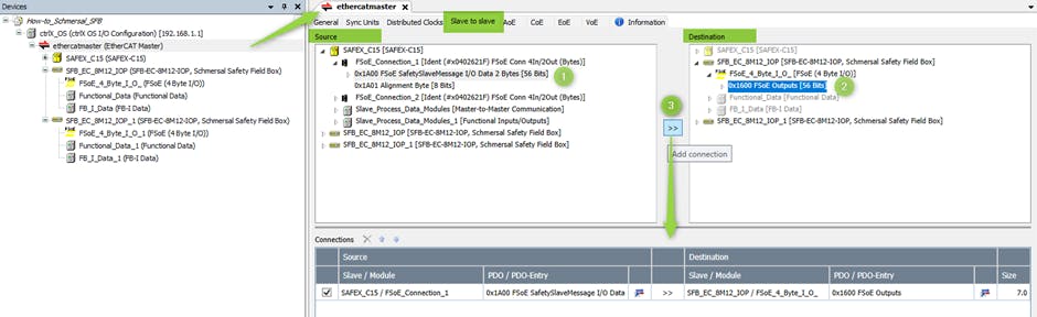 Note: The order of the connections does not matter.Example - first connection from the FSoE master to the first slave: