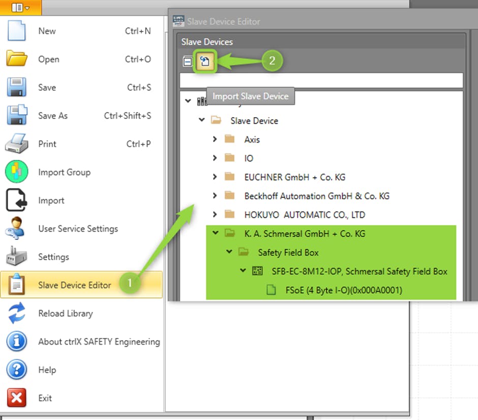 Import the SFB-ESI-file (as before in ctrlX I/O-Eng.) via "Slave Device Editor" in the ctrlX SAFETY Engineering.