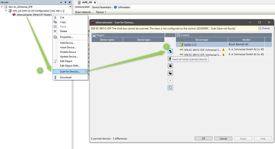 Takeover (1) the detected devices to the project using the OK button and close the dialog: