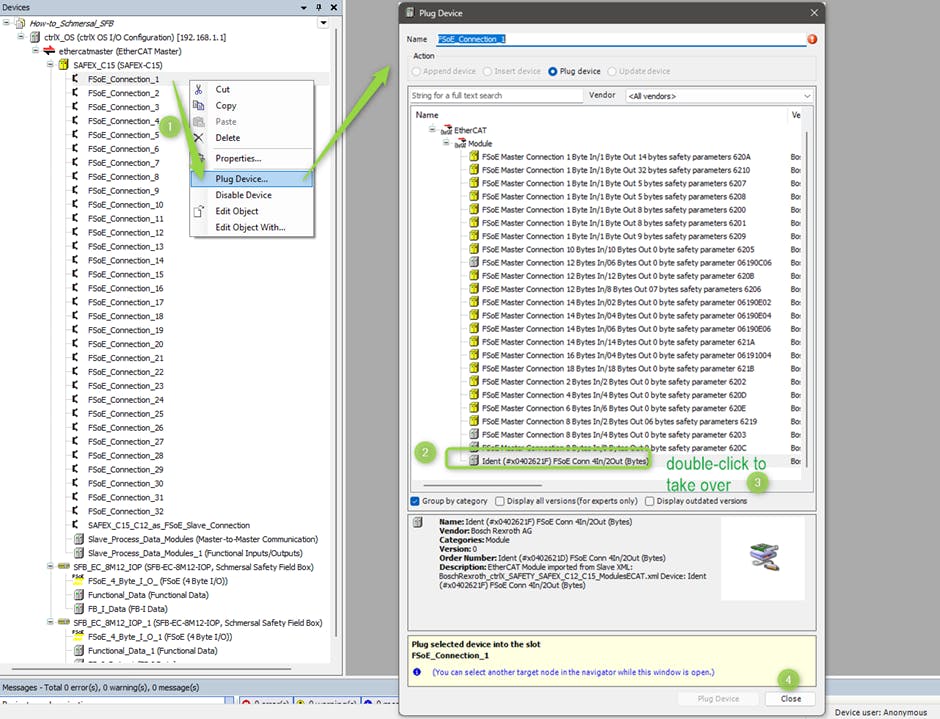 Add the "FSoE master connection" to the FSoE slave for the "SAFEX-C15". Open the "Plug Device" dialog on the first "FSoE_Connection_1" with a right mouse click on "Plug Device...".