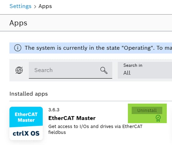 Connect to the ctrlX OS WebUI and ensure that the EtherCAT app is installed and licensed.