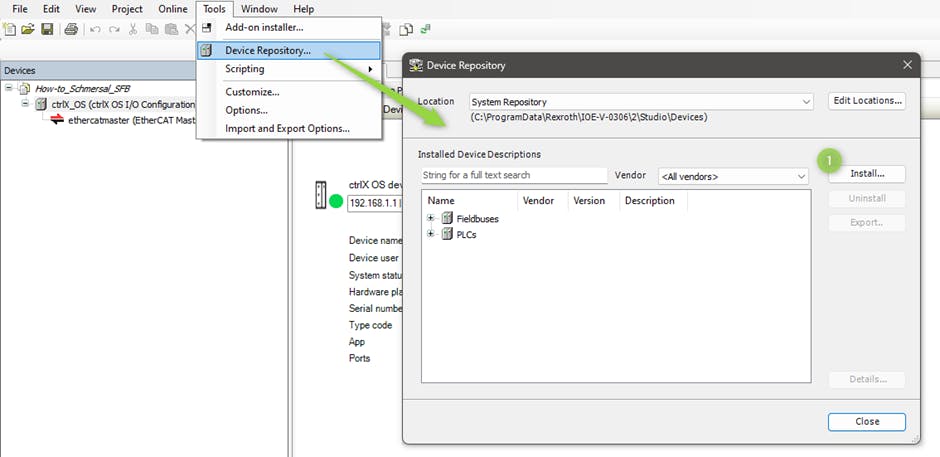 Install the device description files (ESI) for SAFEX-C.1x (two files) and SFB (one file) once in “Tools > Device Repository ... ".