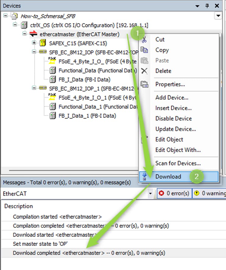 Select the "ethercatmaster" in the project tree again and start downloading the configuration to the controller using "Download". Allow the necessary switchover to the "State Init" by confirming the dialog prompt (not in the screenshot).