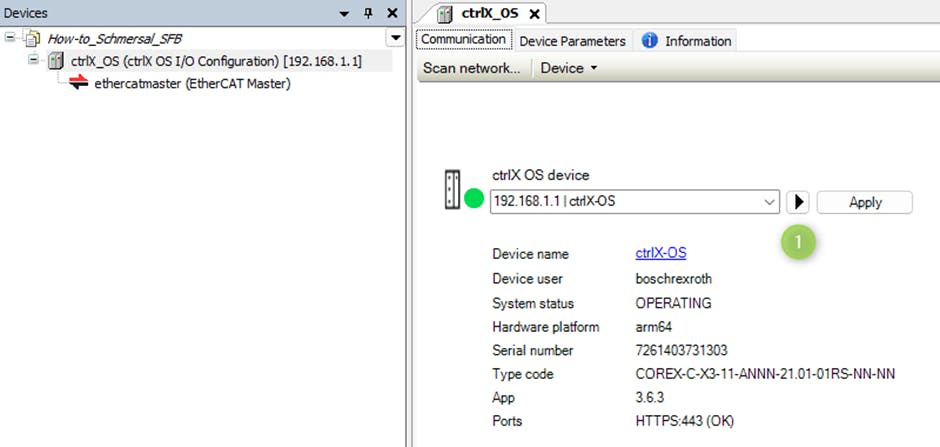 Create a new project (use the template ctrlX OS I/O" if asked) and check or establish the connection to the ctrlX OS device.