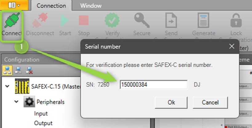 Then press “Connect” and enter the right serial number of the SAFEX-C.15 (“software password”):