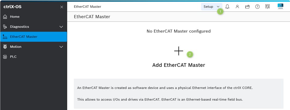 Navigate to the "EtherCAT Master" app area, switch the operation mode to "Setup" (1) and add an "EtherCAT Master" (2).