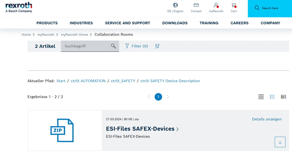 Download the zip-file from the Bosch Rexroth Collaboration Room:Fig. 6.: Download the ESI files for SAFEX-devices from the Collaboration Room Unzip the two files to any folder for later installation, see next step. Both files must be installed: