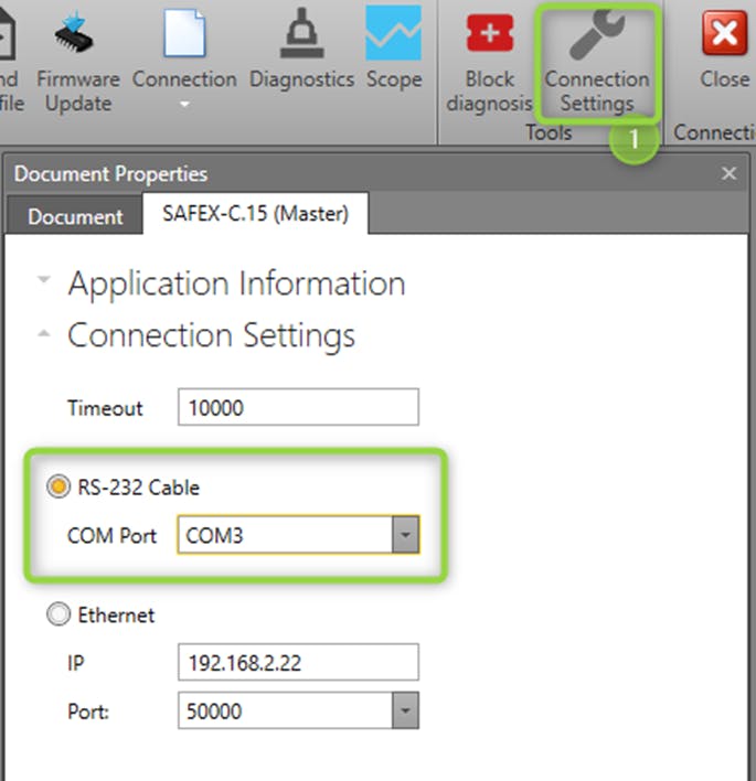 Check or set in the “Connection Settings” the correct way, e.g. the serial connection over the USB-C-connector of the SAFEX-C.15: