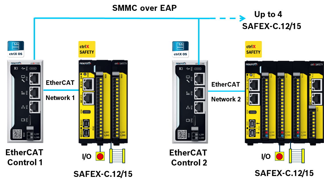 Up to 4 ctrlX SAFETY controllers via Safe-MInstance-to-MInstance-Communication (SMMC) over EtherCAT Automation Protocol (EAP)
