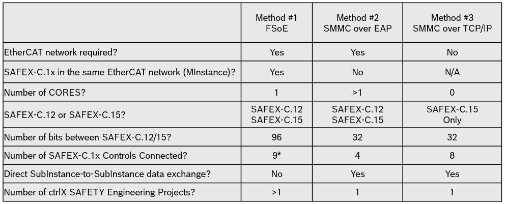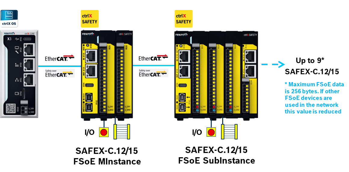 Up to 9* ctrlX SAFETY controllers via Safety over EtherCAT FSoE (maximum 256 bytes per direction)
