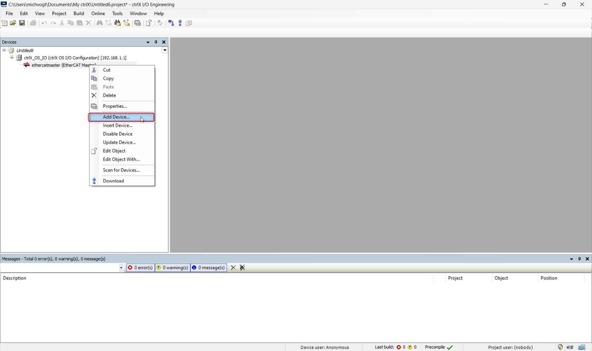 Add the device by right-clicking on the EtherCAT master:
