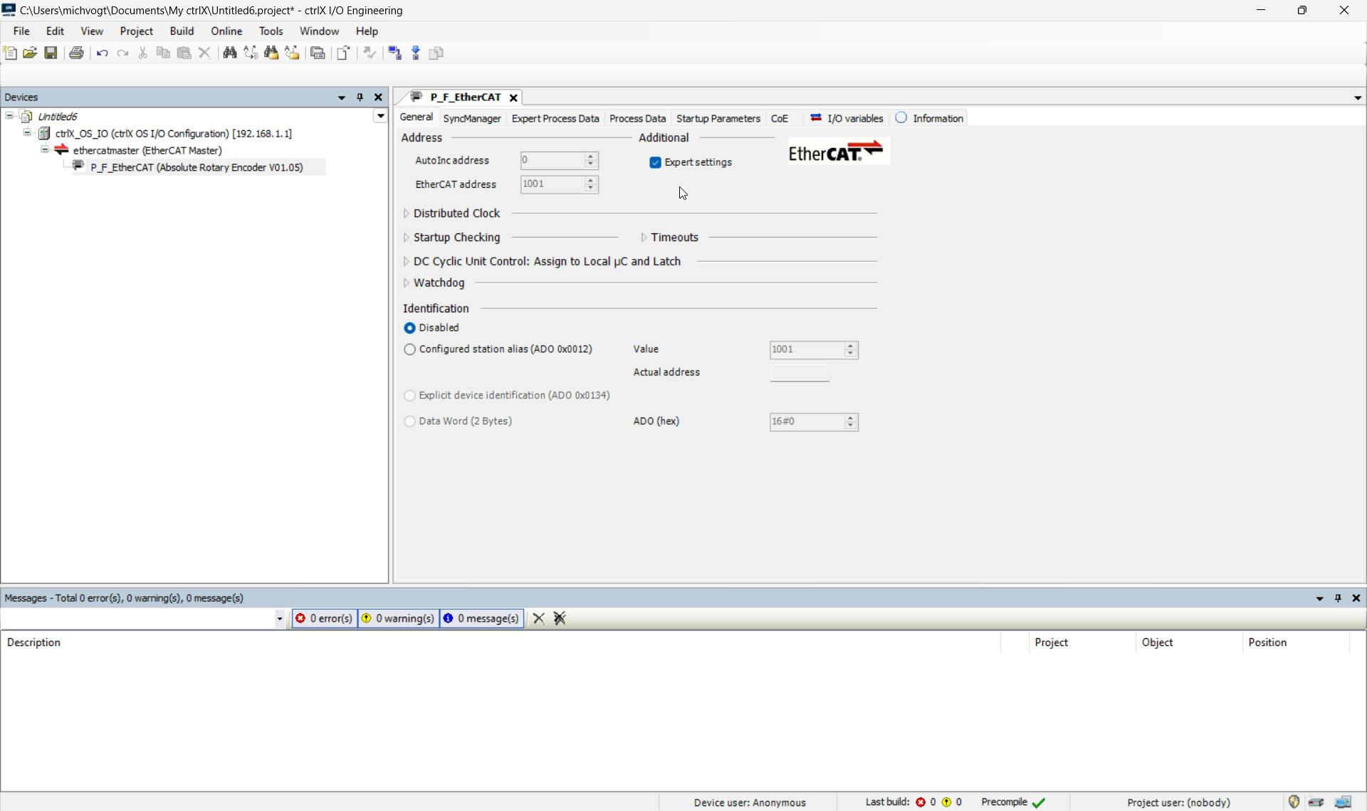 Under General you can activate the "Expert Settings" you can see the EtherCAT Address an the Distributed clock: