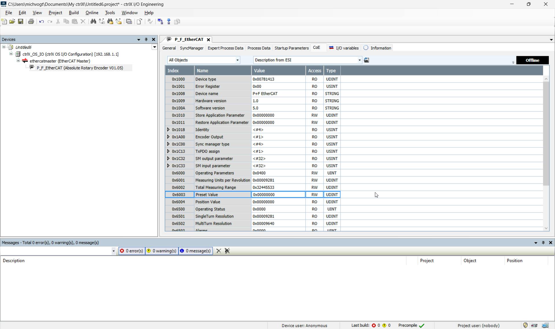 The “Coe” tab shows all objects with the corresponding attributes, which can also be read only or read and written here in online mode, depending on the attribute: