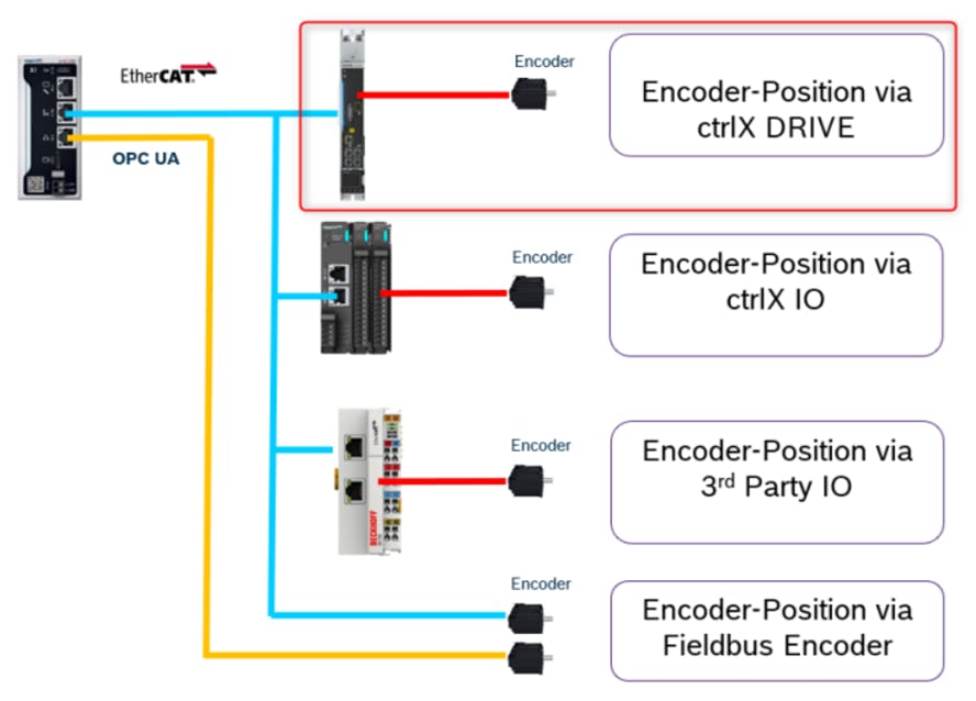 A real encoder can be connected to an encoder interface (hardware) on the ctrlX DRIVE used for evaluating the encoder and providing its values for a higher-level control for further processing.