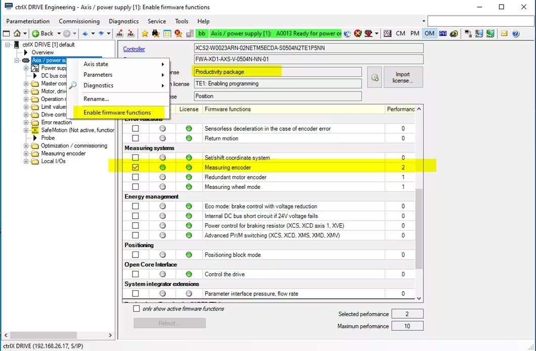 ctrlX DRIVE firmware >= …0504… and Productivity Packet