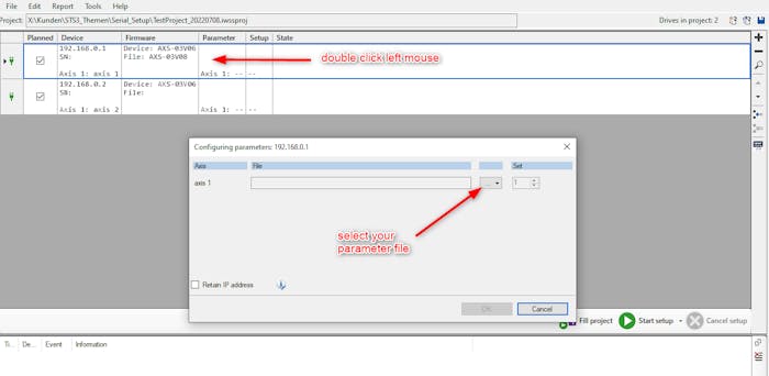 Use the created project for a Serial Setup procedure (including firmware update and parameter file download):