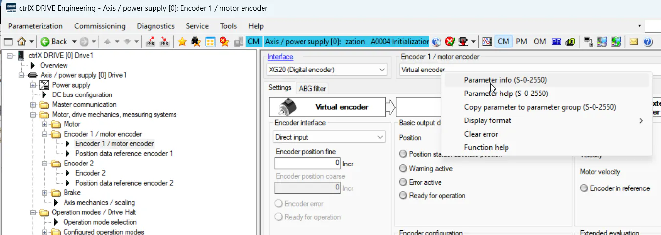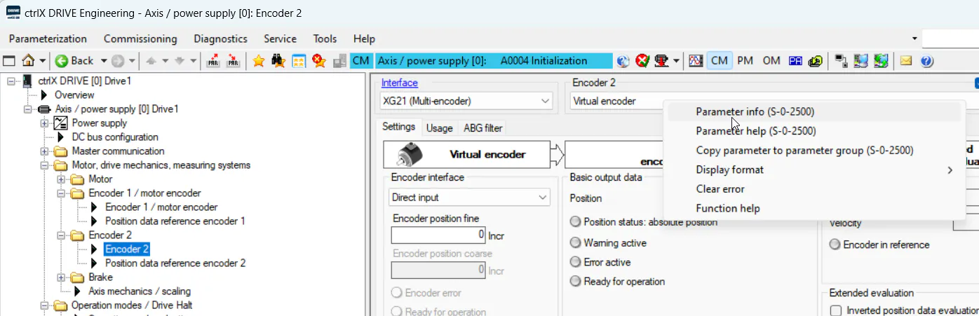 ctrlX DRIVE has a feature to use an externally supplied encoder signal instead of physical encoder interface. This corresponds to a value of 1000 in S-0-2550 for XG20, or S-0-2500 for XG21. But since the virtual encoder setting is associated with the physical encoder interface (not Encoder 1 or Encoder 2) this seems to render the encoder interface unusable for other purposes. Consider a drive that only has XG20 and not XG21. We want use XG20 for the motor encoder like usual, but configure a Virtual Encoder for Encoder 2 as a Measuring Wheel. But if we switch Encoder 2 to Virtual Encoder, now Encoder 1 shows Virtual Encoder because both are linked to S-0-2550. Is there any way around this? And also what is the purpose of the Virtual Peripherals setting for Encoder Interface (P-0-2230)? It looks the same as the Master Communication setting, in which case the encoder signal would be provided in EtherCAT MDT.