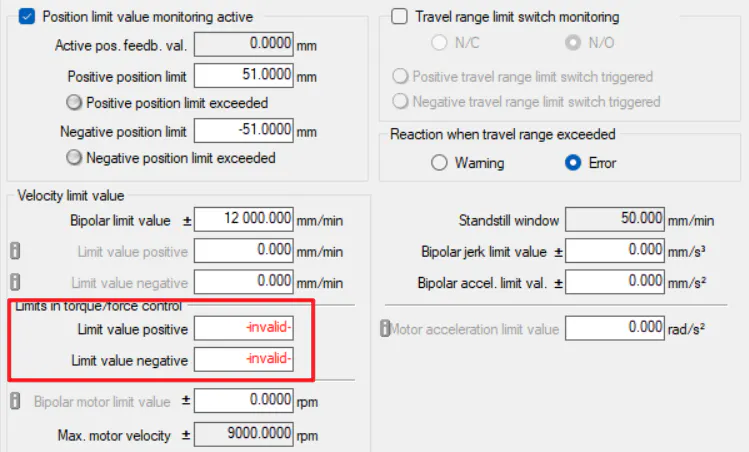 I could set the "limits in torque/force control" normally until some time point, but suddenly the parameters are shown as invalid and I cannot change them anymore. It gave me the pop-up saying "Error when accessing Sercos parameter P-0-0421.0.3", IDN does not exist. Restart does not help.