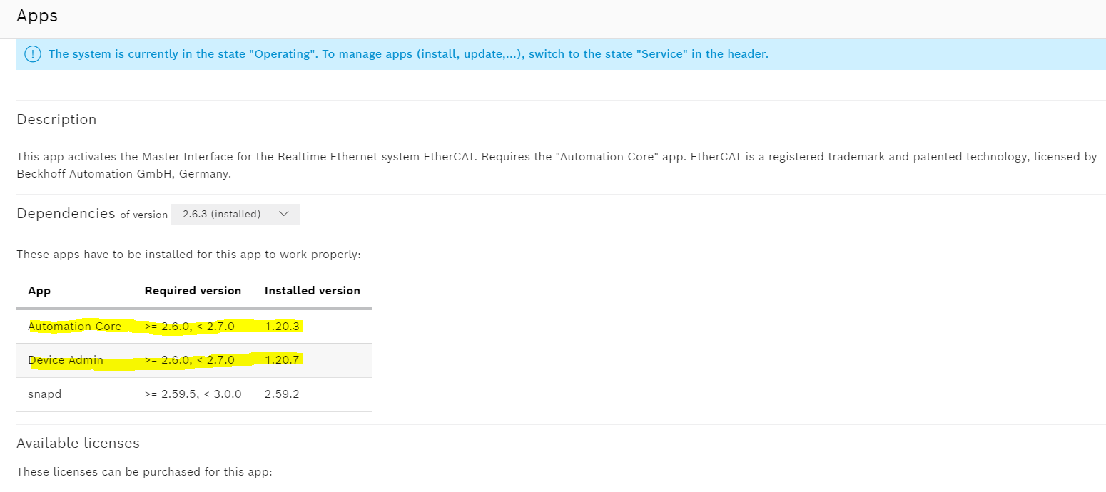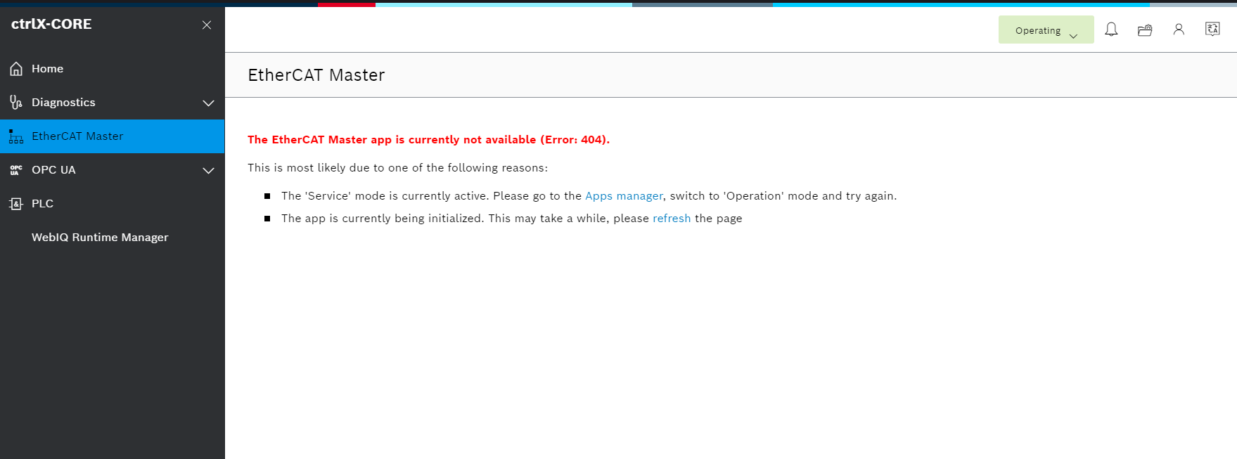 Im using an X3 controller, have the IDE installed on my engineering PC and all the licences were purchased and installed by our rep. Im running into an issue with trying to configure my Ethercat Master app. When I open it up I get 404 message. I did some searching and found that maybe my dependcies for the app arent up to date? Im not sure so I have included a screen shot of what Im looking at.Â