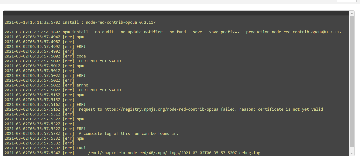 Can you please make sure, that the system time of the ctrlX CORE is set correct. You can reach the time settings in the sidebar under "Settings" on the lower left side of the ctrlX landing page.